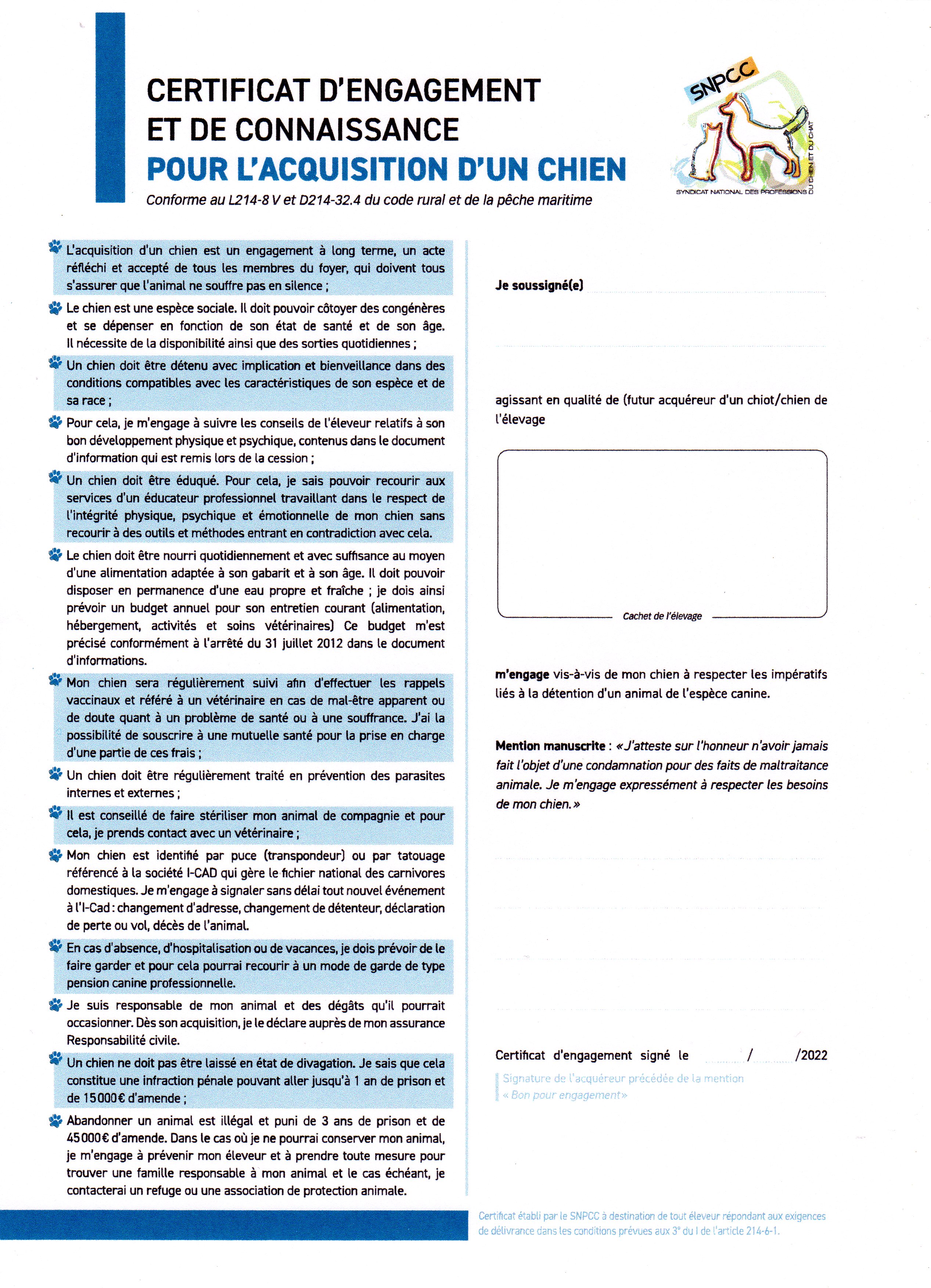 Le "certificat d'engagement et de connaissance pour l'acquisition d'un chien" selon l'article L214-8V et D214-32.4 du Code Rural et de la Pêche Maritime. |