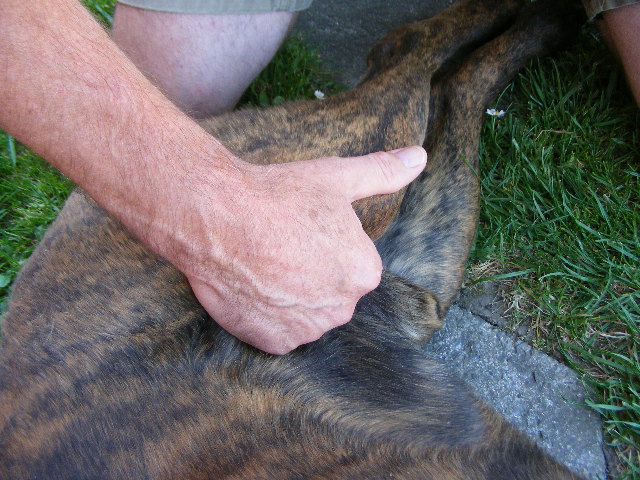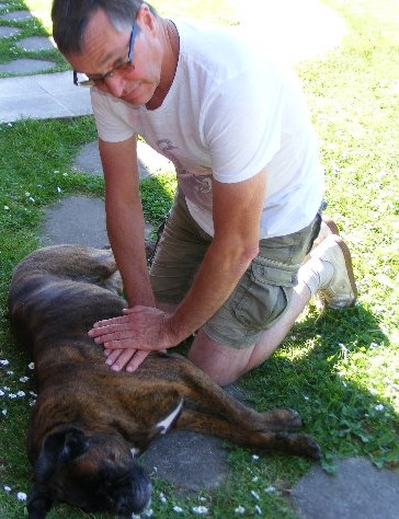 3- Mais avant de commencer les massages cardiaques (car pas de pouls), assurez-vous que les voies respiratoires ne sont obstruées (balles, jouets, etc.). Pour éjecter un corps obstruant les voies respiratoires vous allez devoir pratiquer la "méthode de Heimlich" qui consiste à appliquer 5 pressions sur l'abdomen (en dessous de la cage thoracique) en positionnant la tête du chien en bas, son dos contre votre poitrine. |