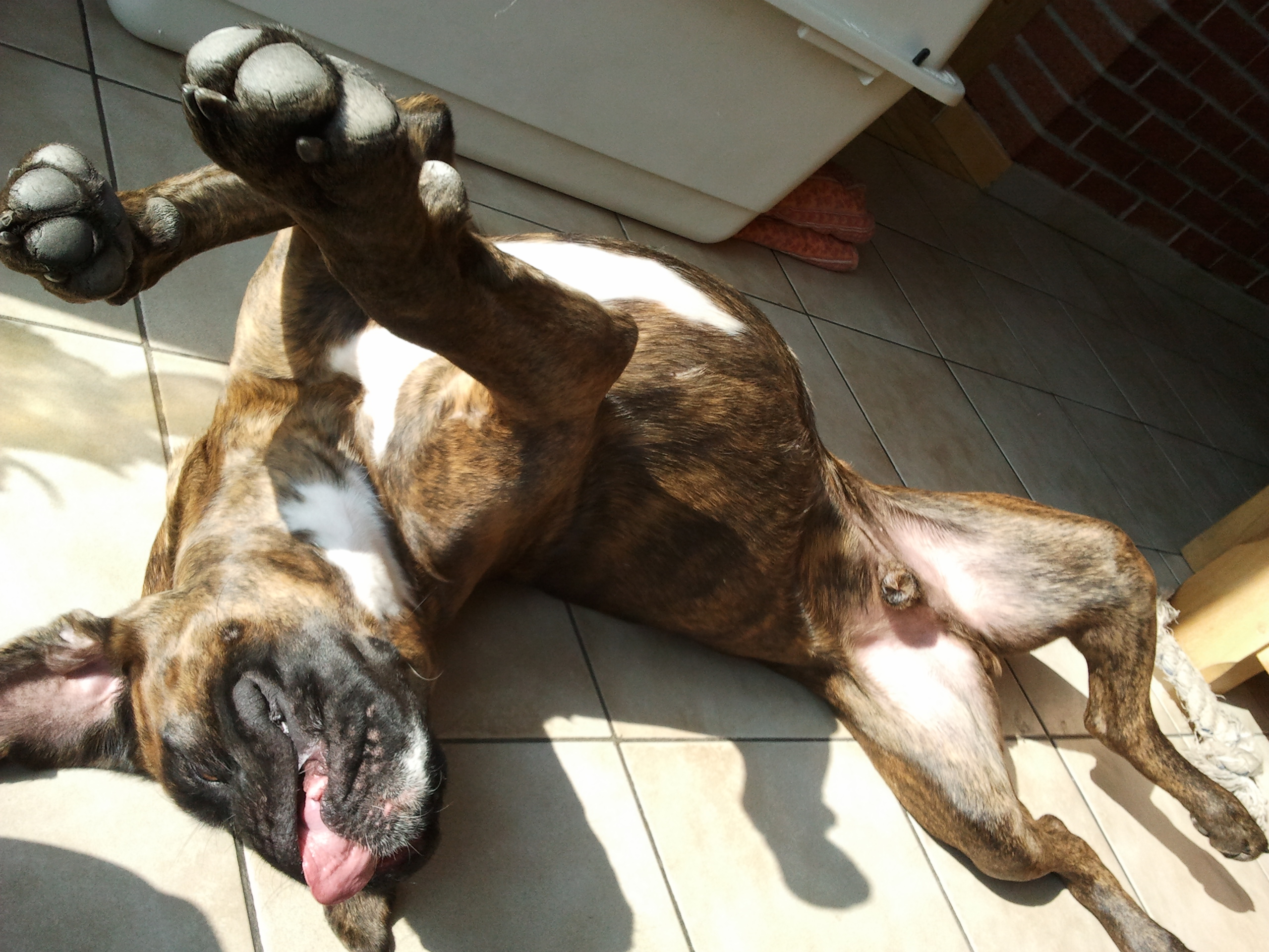 Devant la porte fenêtre Driver, boxer bringé, qui profit du soleil printanier