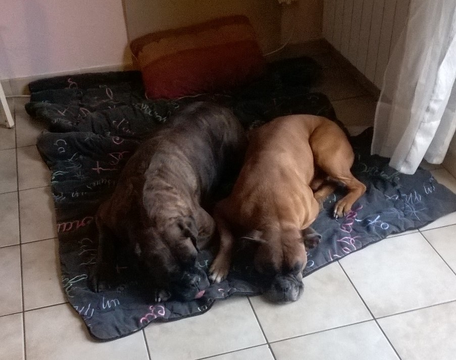 À peine arrivé à la maison les premiers accrochages étaient avec Cyrius, boxer fauve de ma fille aînée. Quelques jours plus tard, pour notre plus grand plaisir ils jouaient et dormaient ensemble.