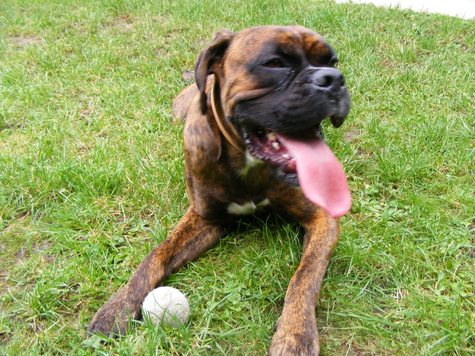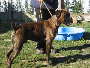 Fin de matinée du samedi 18 septembre 2010, à peine arrivé au refuge de La Roche/Yon, la directrice m'invita à aller le voir dans son box afin de confirmer le désir de l'adopter. Dans le fond du box, j'ai découvert un boxer au corps maigre avec une grosse tête qui s'est mis à aboyer dès qu'il m'a vu (*). Contre la modique somme de 125 €uros, je suis reparti avec un échantillon de croquettes, un jeune boxer pucé et vacciné muni d'une laisse et d'un collier. Dans le commentaire de la SPA, il est noté: "Toute l'éducation à refaire. |